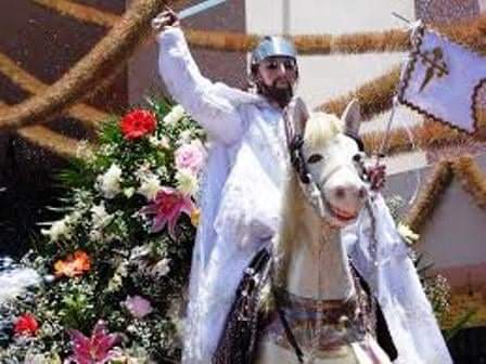 Y poco a poco fueron pasando ante él los numerosos grupos de tlahualiles, y al final venía una Imagen de un personaje montado en un caballo blanco; llevaba una bandera y en la cabeza una especie de coraza, como las que usaban los antiguos guerreros europeos.
