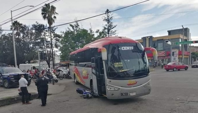 Un imprudente motociclista resultó con lesiones leves, al intentar “ganarle” el paso a un autobús en un crucero. (Calle 12)