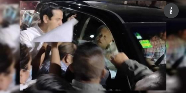 Con evidente molestia, el mandatario tuvo que esperar dentro de su camioneta, resguardado por su equipo de seguridad.